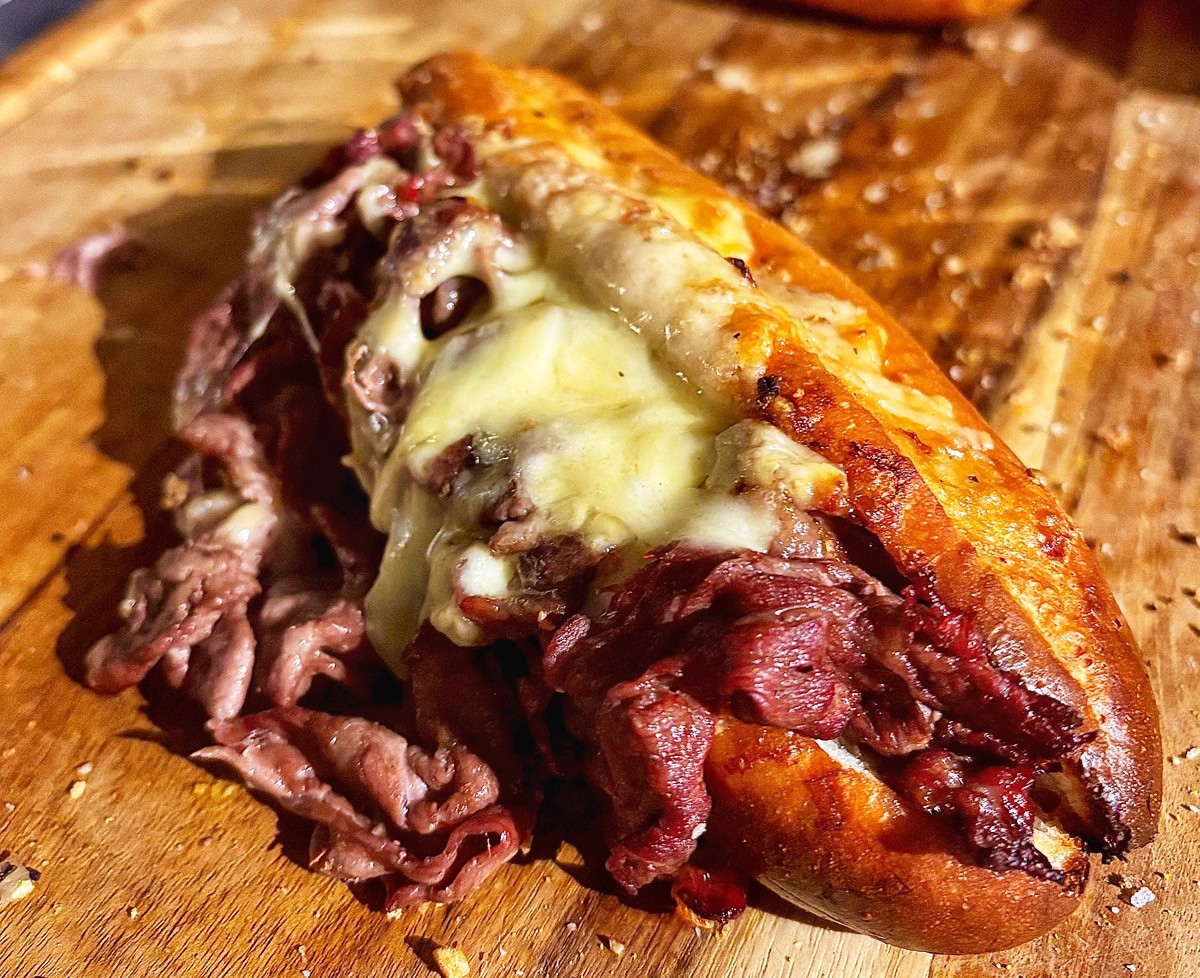 ▼アメリカ・フィラデルフィア発祥のホットサンド「フィリチーズステーキサンド」(980円)。ジューシーなグリルビーフをあふれんばかりにパンに挟みこんだボリューム満点の逸品です!