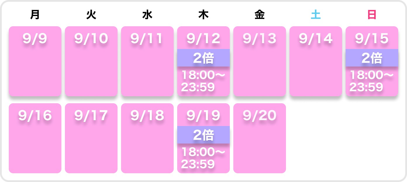 ※対象者には、2倍対象日の翌営業日21:59までにポイントが加算されます。(9/15(日)分は9/17(月)21:59までに加算いたします。)