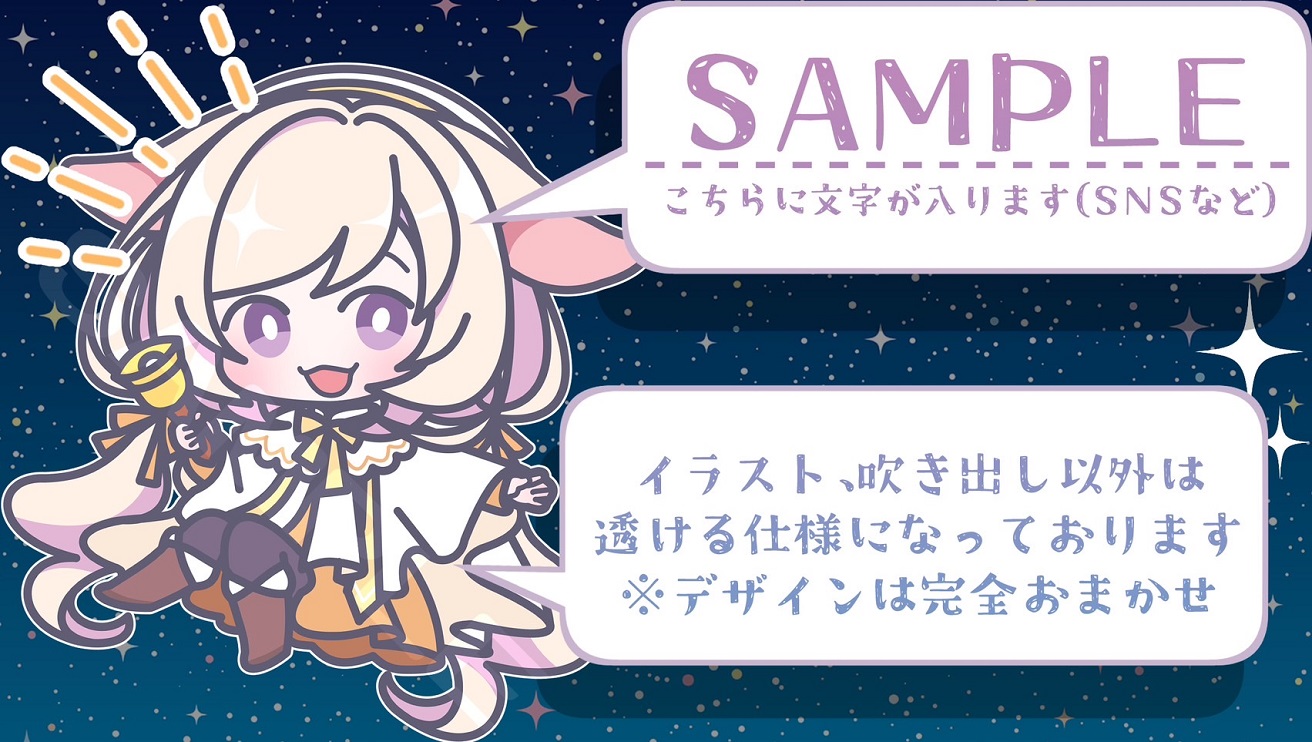・ヴィネットイラストのほか、アバター提出用にSHOWROOMのアバターガイドラインに則ったバージョン(キャラクターのみのバージョン)もお渡しいたします。