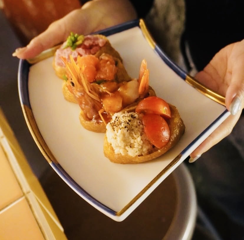 看板メニューは、酢飯を油揚げに包まずにさまざまな具材をのせた「創作いなり寿司」。新鮮な鮪とたくあんのシャキシャキ食感が絶妙な「本鮪ごろごろとろたく」や、サーモンといくらがこぼれんばかりに乗った親子いなり「サーモンいくら」、“ピリ辛”がクセになる「エビチリ」、柚子胡椒の味がしっかり染み込んだ「ホタテ柚子胡椒」など、個性あふれるラインナップを誇っています。