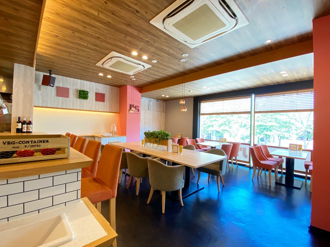 甘酸っぱいドライクランベリーをたっぷり練り込んだピンクのバンズが可愛いハンバーガーが自慢のカフェです。お店で毎日、生地から捏ねてひとつひとつ丁寧に手で丸めて焼き上げるバンズは、小麦粉の品種選びから製法までこだわりぬいたオリジナルレシピ。イーストフードや合成着色料、マーガリンなども一切使わずに作っています。