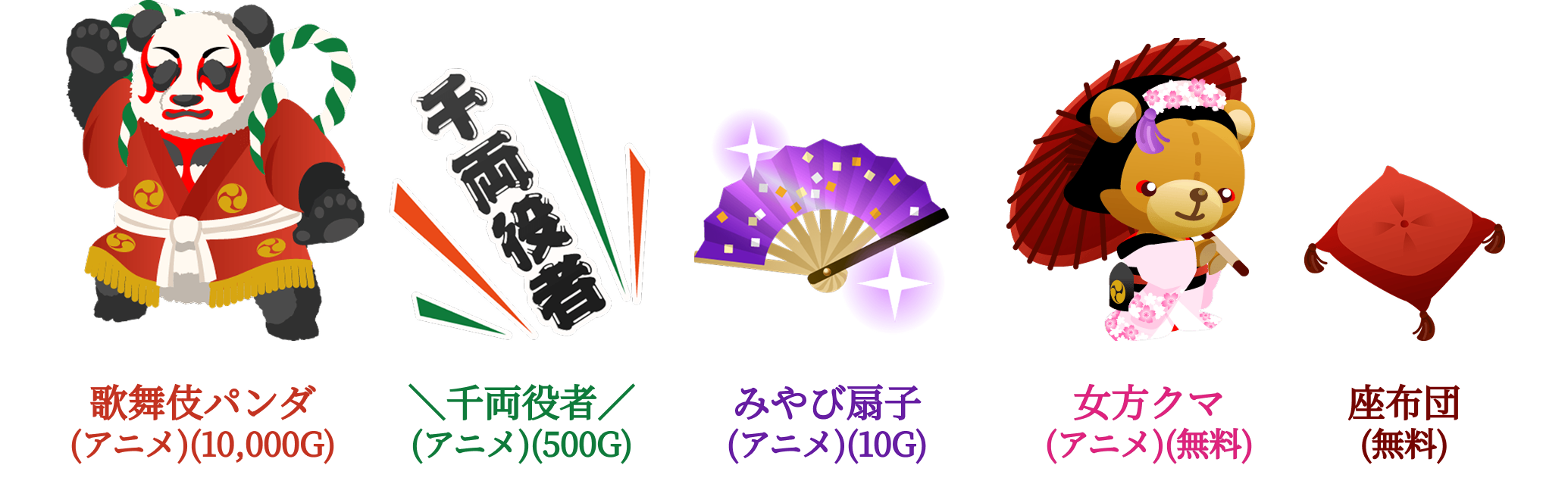 条件:歌舞伎パンダ(アニメ)ギフト、\千両役者/(アニメ)ギフト、みやび扇子(アニメ)ギフトを、下記pt分ギフティングする