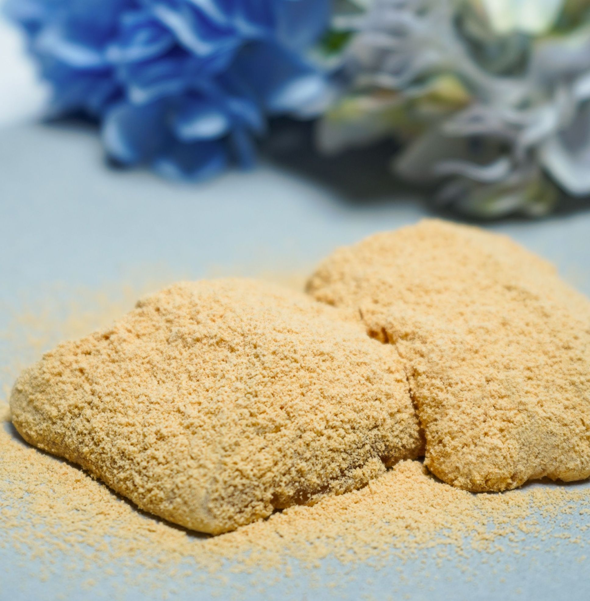 ▼希少な国産本わらび粉に鎌倉秘伝の配合を加え、わらび粉のみでは出せない、極上のもっちり感ととろける口溶けを実現した「鎌倉わらびもち」