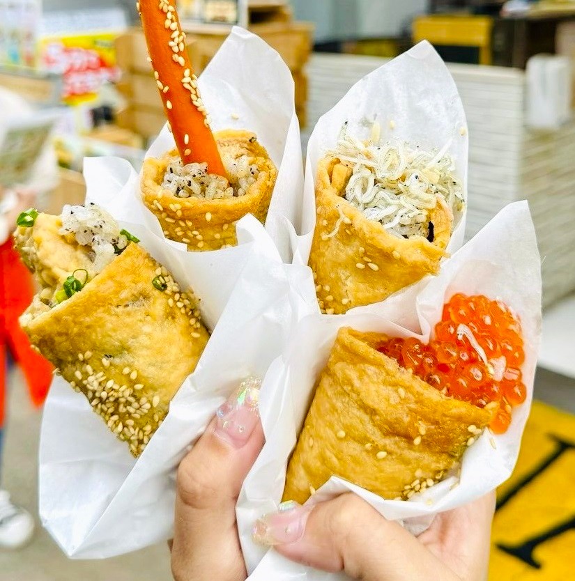 ▼店頭でさまざまな食べ歩きグルメを販売している『はんなりいなり』鎌倉小町通り本店。店内には清潔感あふれるイートインスペースもあります!