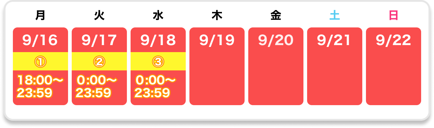 Monday, 16/09/2024 18:00 〜 Sunday, 22/09/2024 21:59