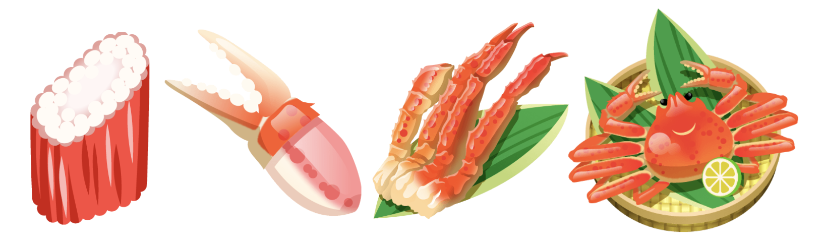 カニかま(1G)、カニの爪(10G)、カニの脚(100G)、豪華タラバガニ(10,000G)
