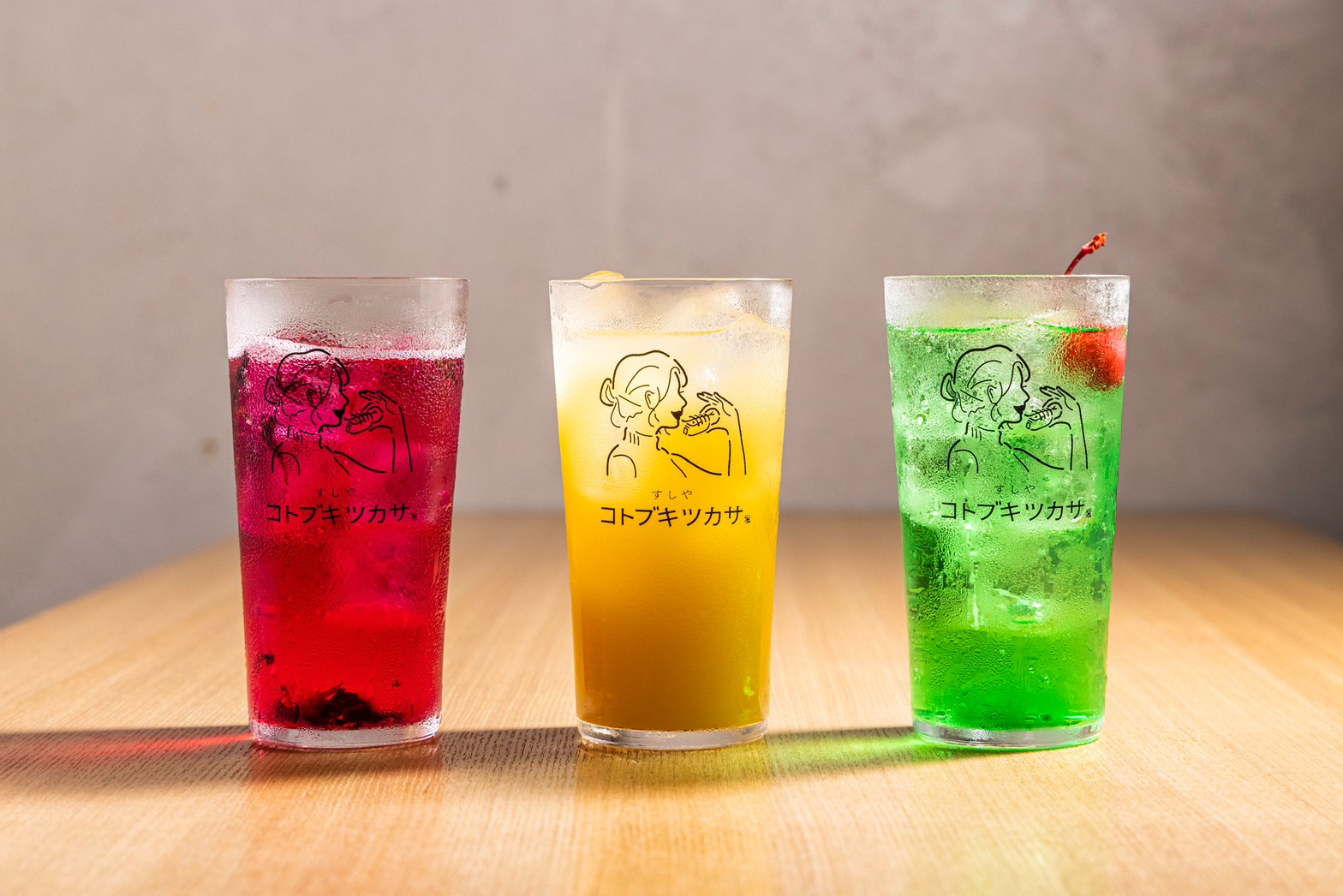 店名の由来である「寿(コトブキ)司(ツカサ)」を表したロゴマークのネオンサインと、インパクトあるシースルーの大きな提灯が印象的な外観、そして、無垢の木材を基調としてデザインされたインテリアは、カウンター席とテーブル席、ロフト席の3つのゾーンで構成され、まるでお洒落なカフェのような雰囲気を演出しています。