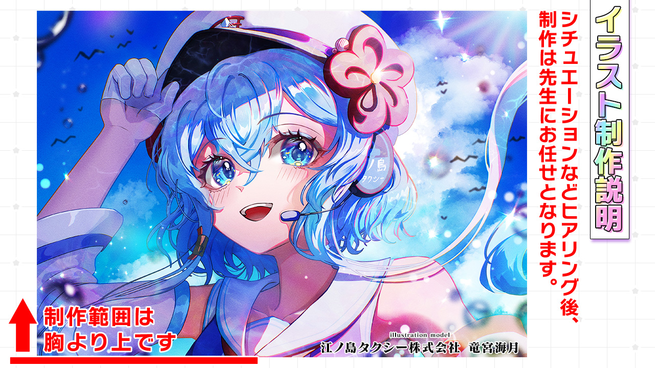 ・2024/04/14(日)23:59までに、イラスト制作に必要な「宣材写真or立ち絵orアバターイラスト」の提出をお願いいたします。(サイズ・ファイル形式は問いません)