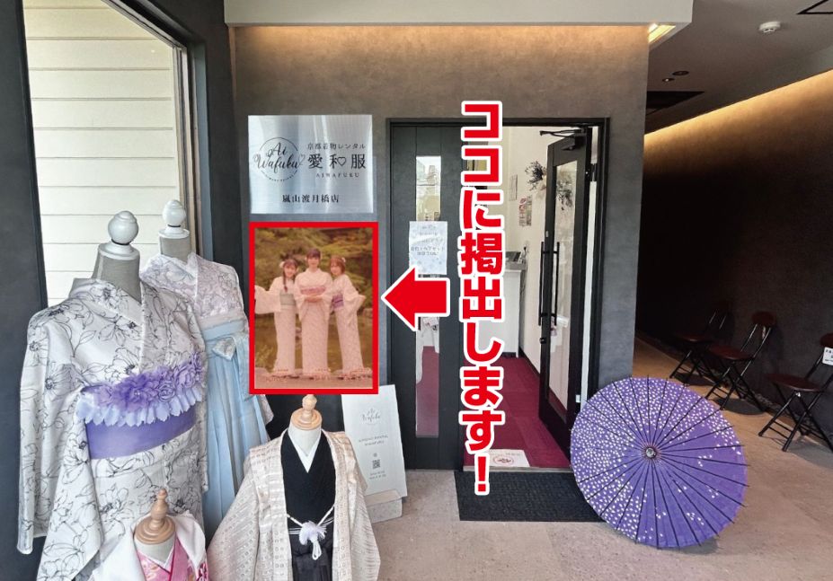 ⑥あなたと審査員特別賞受賞者のポスター(タテ約80cm×ヨコ約60cm)を制作し、『京都愛和服』嵐山渡月橋店の店頭に掲出いたします。