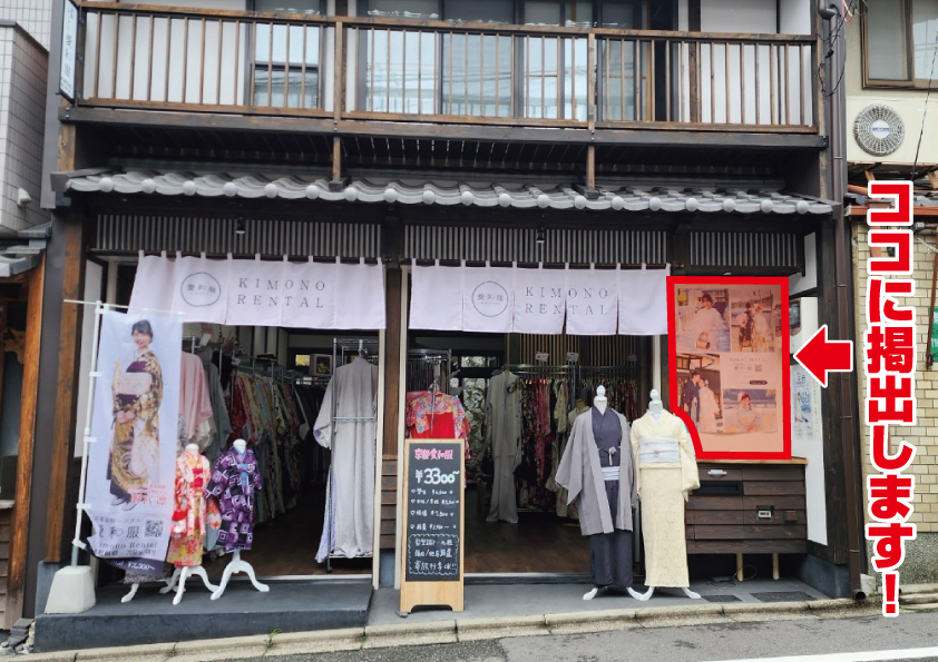 ⑤あなたと審査員特別賞受賞者のポスター(タテ約135cm×ヨコ約90cm)を制作し、『京都愛和服』清水店の店頭に掲出いたします。