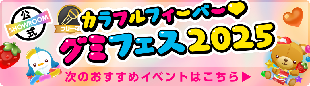 ・本イベントはSHOWROOM株式会社が運営しております。 ・下記注意事項およびSHOWROOM会員規約その他のルールを守って配信しましょう。 ・他者が嫌がるような迷惑行為はしないようにしましょう。 ・審査状況や選考基準に関するお問い合わせには基本的にお答えできかねます。 ・応募・審査通過等によって生じる権利を第三者に譲渡・質入等することはできません。特典の対象は獲得したルームの方のみです。特典を獲得したルームの方以外の方(グループ全体、グループメンバーなど)が特典を実施することは禁止といたします。 ・アバター、ギフティングアイテム等デジタルコンテンツの制作権を獲得された場合、SHOWROOM株式会社が作成する[ガイドライン]・[利用規約]に準じている作品の制作をお願いいたします。これらに違反している場合は、獲得したコンテンツをご利用いただけませんので十分ご注意ください。 ・本注意事項およびSHOWROOM会員規約その他のルールに違反した場合またはその他当社が不適切であると判断した場合は、応募及び結果を無効とし、または取り消す場合があります。 ・応募条件を全て満たさずにエントリーされた場合には、いかなる理由であってもエントリーを取り消し、特典の権利を無効とさせていただく可能性があります。 ・バーチャルライバーに関しては各人の世界観により定義された性別です。 ・イベントを途中離脱された場合には、いかなる理由であっても特典の権利を無効とさせていただきます。該当のライバーにギフティングされたリスナーへの返還、返金等もいたしかねますので、予めご了承ください。 ・金銭、物品、その他プレゼント(チェキ、お礼カードは除く)を視聴者に贈り応援を促進させる行為は禁止します。 ・重複アカウントによる応援は禁止です。重複アカウントによる応援ポイント分は発覚次第、減算を行います。なお、当サービスのセキュリティ上、対応や減算の仕組みの詳細に関しましては個別にご案内を差し上げておりません。予めご了承ください。 ・本アプリ内で開催されるキャンペーン・イベント・コンテスト等にアップル社、グーグル社は一切関係ありません。 ・天災、不慮の事故などのやむを得ない事情により特典履行が行えない場合、特典が変更・補填・中止となることがございます。予めご了承ください。 ・万が一、前項に定める事由による特典履行が変更、中止となった場合、その他本イベントの応援ポイントが取り消しされた場合であっても、SHOWROOM株式会社は当該応援ポイントにかかるデジタルコンテンツまたはShow Gold、現金その他の返還はいたしません。予めご了承ください。 ・イベント終了後に減算されてポイント未達成になった場合、特典は取り消しとさせていただく場合があります。 ・ランキングが関わるイベントの場合、グループメンバー同士(グループアカウント、個人アカウント問わず)、または、イベント参加者の関係者(マネージャー・プロデューサーなどの直接的な利害関係者)の応援はコメントのみ可能とし、有料ギフト・無料ギフトによる応援は禁止とさせていただきます。 ・公式ライバーの方が報酬のある特典を獲得された場合は、所属オーガナイザー・所属事務所等にご確認の上ご対応ください。