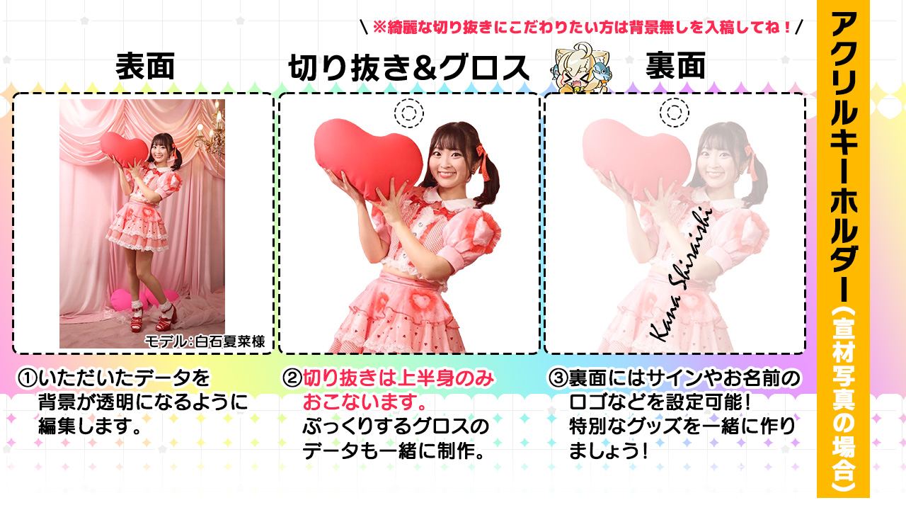 ※綺麗な切り抜きにこだわりたい方は背景無しで入稿をお願いいたします。