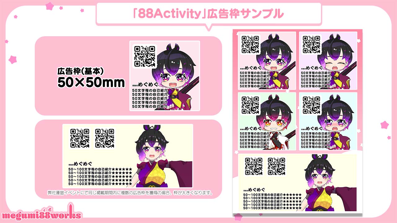 ・広告枠のサイズはヨコ50mm×タテ50mmとなります。同じ掲載期間内に複数の「88Activity(パチパチアクティビティ)」広告枠を獲得した場合、枠が大きくなります。