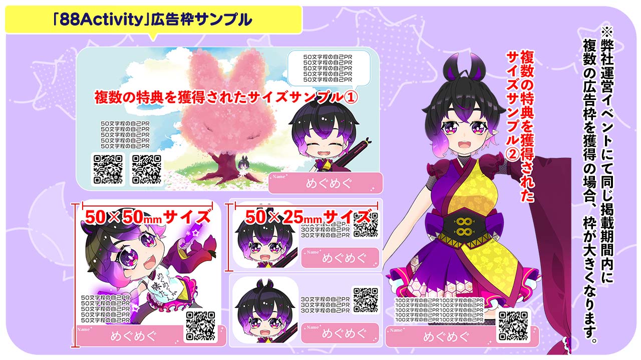 ・広告枠のサイズはランキング2位が「ヨコ50mm×タテ50mm」となります。ランキング3位は「ヨコ50mm×タテ25mm」となります。同じ掲載期間内に複数の「88Activity(パチパチアクティビティ)」広告枠を獲得した場合、枠が大きくなります。