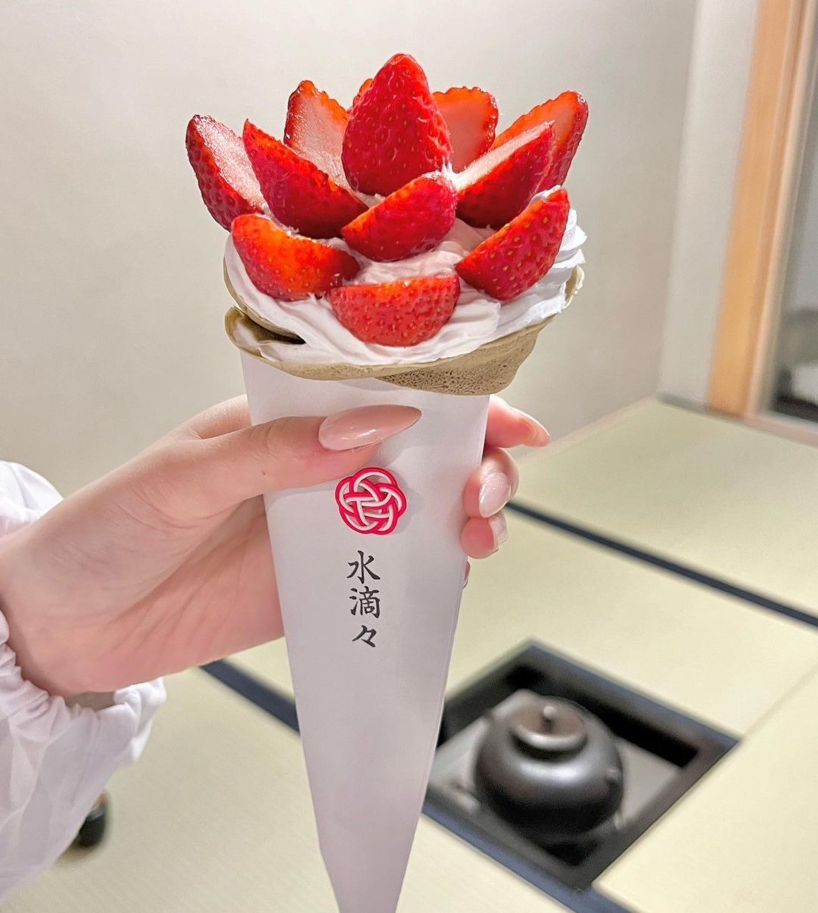 ▼お茶を活かしたクレープも大人気!写真は「ほうじ茶いちごミルククレープ+いちご増し」