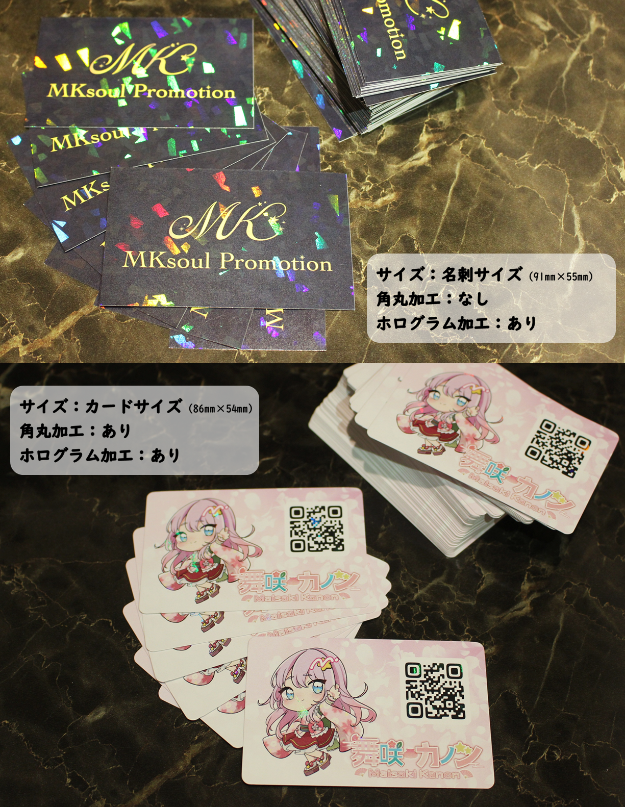 ・各デザインごとに、サイズを「91mm × 55mm (名刺サイズ)」「86mm × 54mm (カードサイズ)」から、また、角丸(3R(3mm))・ホログラム加工の有無を選択いただきます。