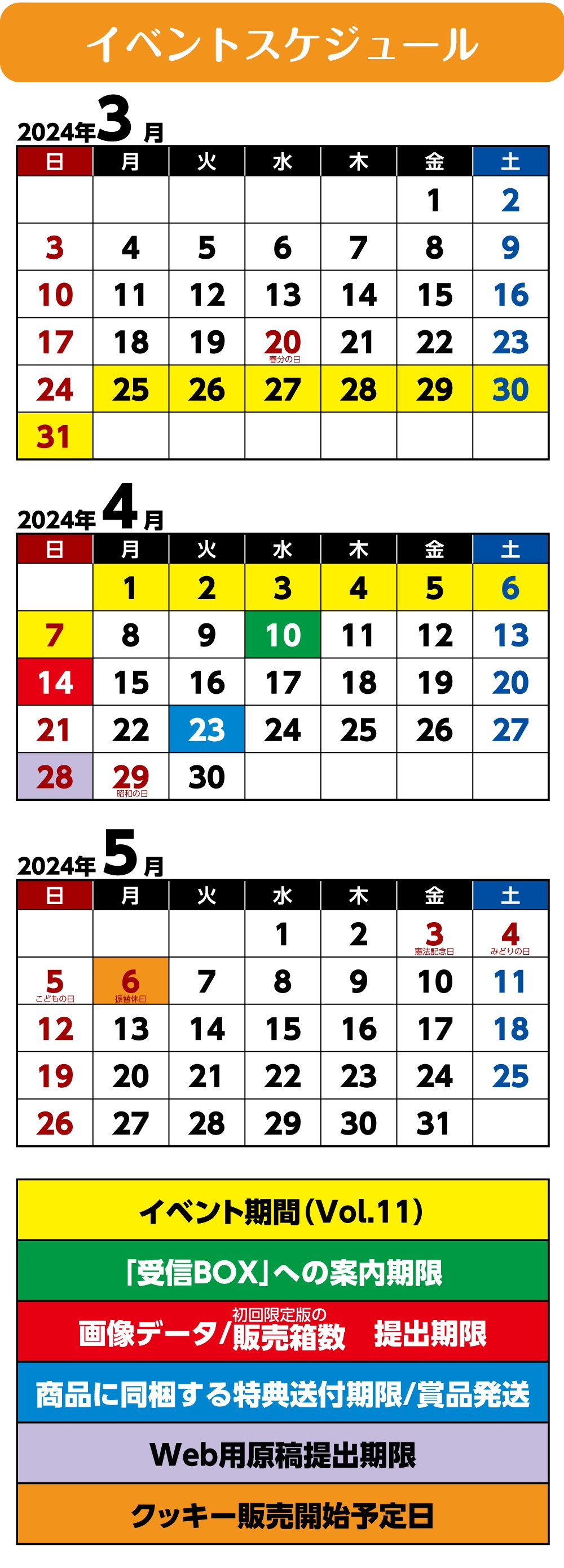・2024/4/14(日) 23:59までに、クッキー及びパッケージ用画像データ(クッキー用:縦50mm×横50mm、解像度350dpi推奨、パッケージ用:横137mm×縦185mm、解像度350dpi推奨)をご提出、初回生産の販売箱数をご連絡ください。