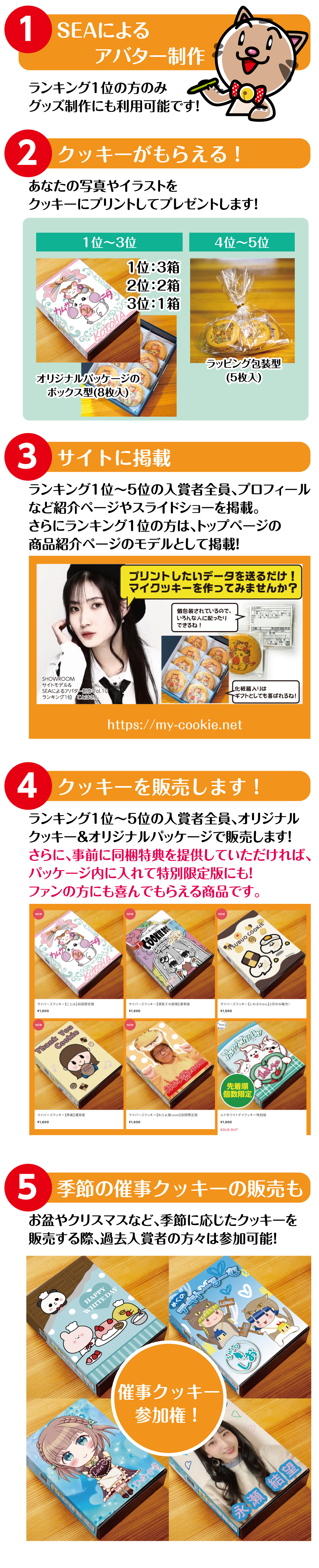 マイクッキーサイトのトップ画面を飾るモデル、あなたのクッキーを制作して販売、プロフィールの掲載、さらにバーチャルライバーSEAによるオリジナル描き下ろしアバター制作権獲得と、超てんこもりイベント!