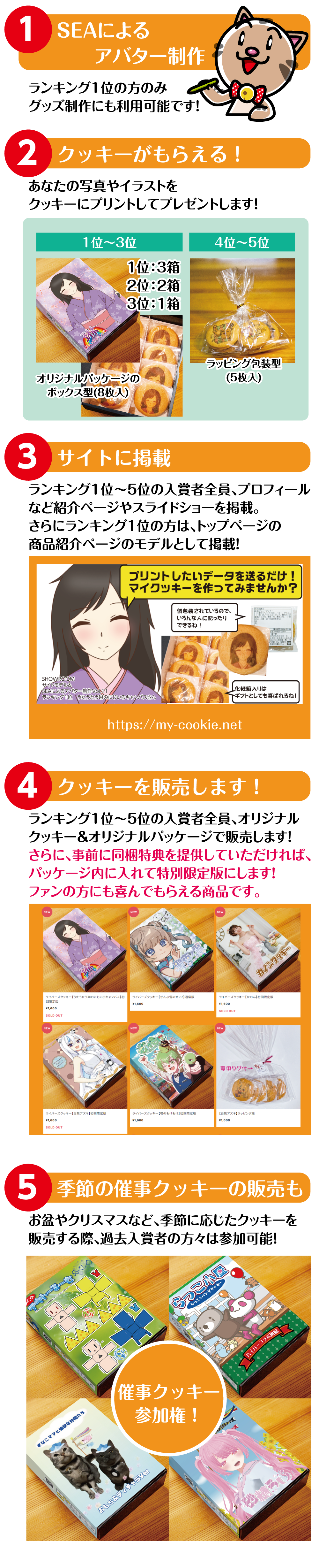 マイクッキーサイトのトップ画面を飾るモデル、あなたのクッキーを制作して販売、プロフィールの掲載、さらにライバーSEAによるオリジナル描き下ろしアバター制作権獲得と、超てんこもりイベント!