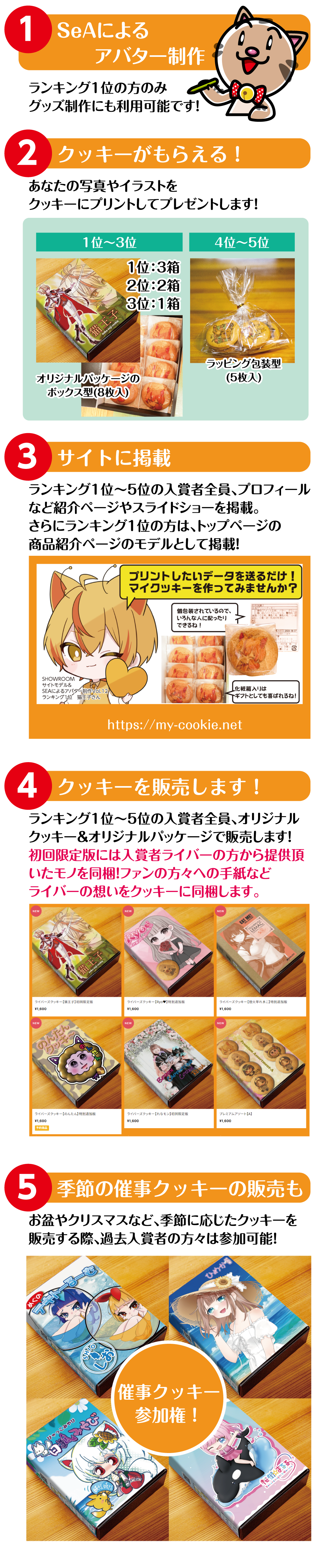 マイクッキーサイトのトップ画面を飾るモデル、あなたのクッキーを制作して販売、プロフィールの掲載、さらにライバーSeAによるオリジナル描き下ろしアバター制作権獲得と、超てんこもりイベント!