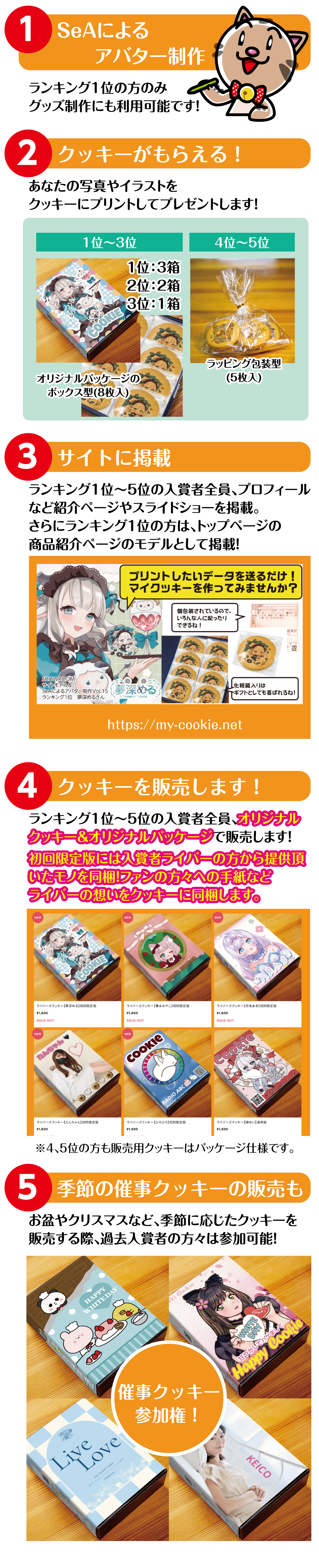 マイクッキーサイトのトップ画面を飾るモデル、あなたのクッキーを制作して販売、プロフィールの掲載、さらにライバーSeAによるオリジナル描き下ろしアバター制作権獲得と、超てんこもりイベント!