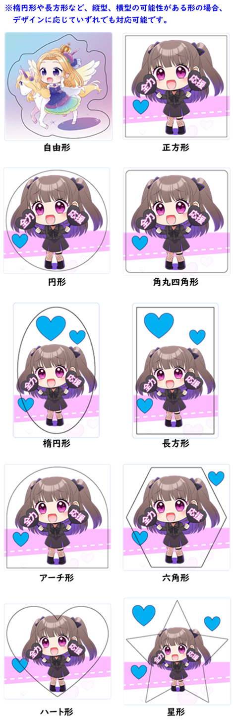 ・形を「自由形」「正方形」「円形」「角丸四角形」「楕円形」「長方形」「アーチ形」「六角形」「ハート形」「星形」から選択いただきます。縦型、横型の可能性がある形の場合、デザインに応じていずれでも対応可能です。