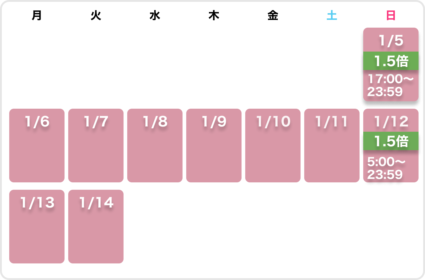 ※対象者には、各ボーナスデーの翌営業日23:59までにポイントが加算されます。(1/12(日)分は1/14(火)23:59までに加算いたします。)