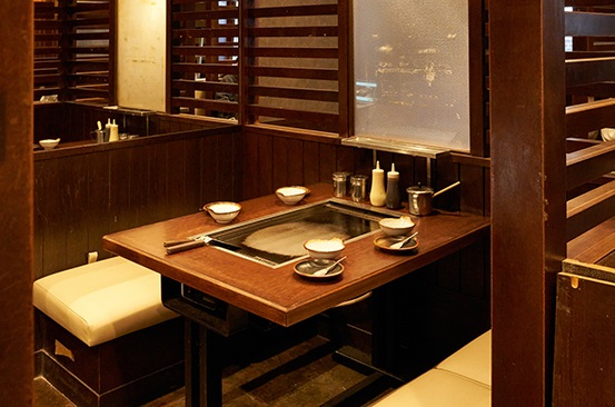 ▼木目調の内装に暖色系の照明が灯り、温かく落ち着いた雰囲気の店内。2階席はBOXテーブル席、3階席は小上がりテーブル席となっており、全卓に鉄板が備え付けられています♪