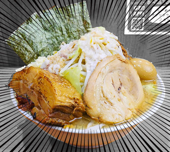 大量の肉と豚骨をとことん煮込んだ濃厚なスープに極太平打ち麺がよく絡む、二郎インスパイア系らーめん店です。