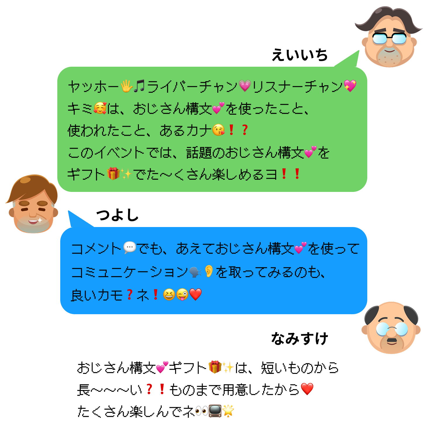 やぁみんな!(`・ω・´)ノ元気にしてるカナ? おじさんは今日もバリバリ元気ダヨ!(^_-)-☆ ところで、最近ウワサの「おじさん構文」って知ってるカナ?! これは「おじさん構文」を使って、配信を楽しんじゃオっていう、ステキなイベントだヨ(゚∀゚)8888 キミ♡のルームでも、おじさん構文が飛び交う様子は面白いハズ(≧▽≦)b ギフトやコメントでドンドン盛り上げて、みんなで楽しんじゃえ((o(´∀`)o))ワクワク