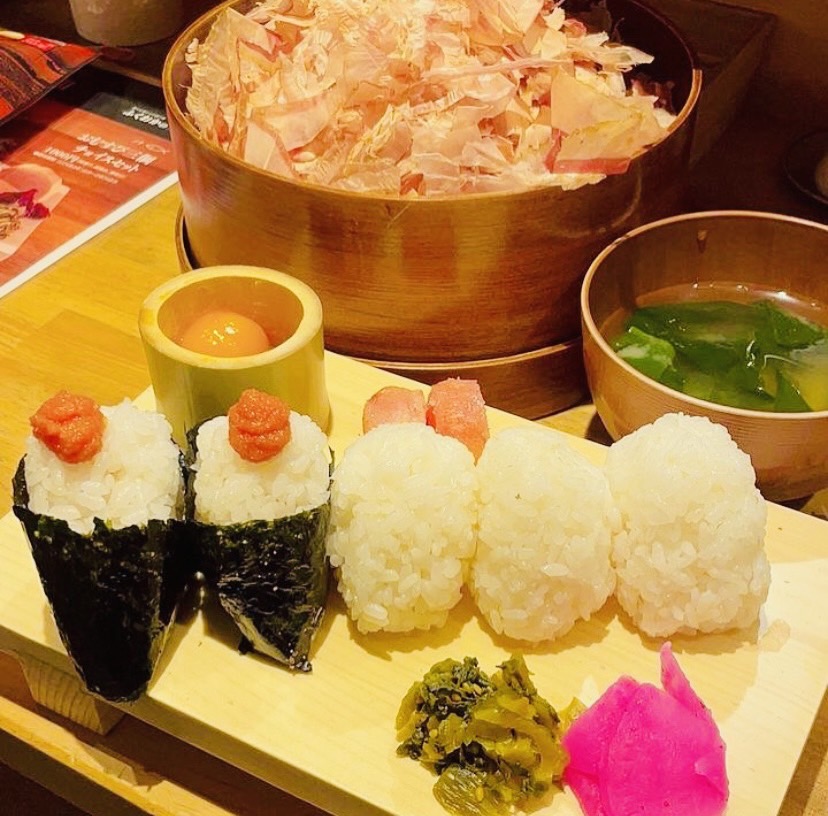 素材と握り方に徹底してこだわっており、お米は生産者さんから直送される栃木のブランド米「とちぎの星」を使用。海苔は、柳川から有明海苔を直接仕入れています。特に人気のメニューは、「明太ししゃも」と「いか明太」。あおさのお味噌汁とだし巻玉子が付く、満足度抜群のセットもおすすめです♪ほか、毎日先着2名様限定の「いくらかけ放題」(+300円)や、「おむすび食べ放題」(20分1,500円)など、ワクワクする催しも盛りだくさん☆