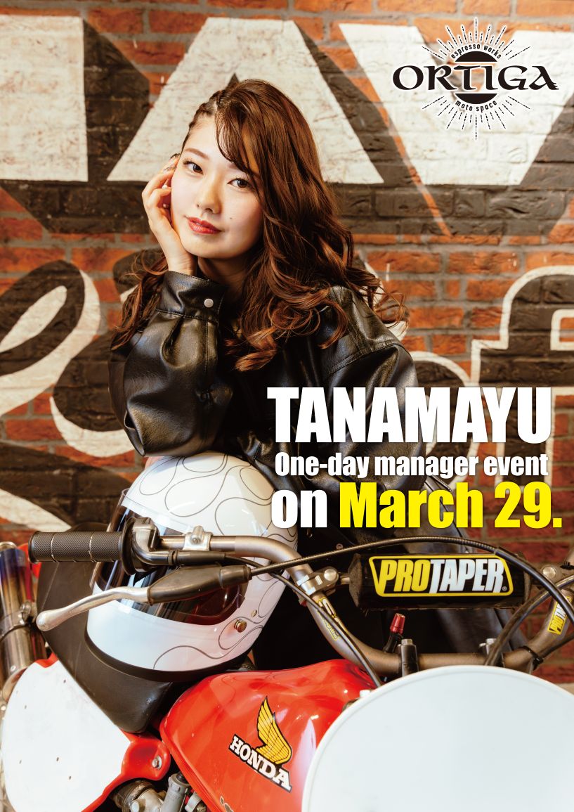 ▼2025年2月に開催された【バイク乗りが創ったガレージカフェ『ORTIGA』1日店長オーディション】にてランキング1位を獲得された「たなまゆ」さんの1日店長イベントポスター。