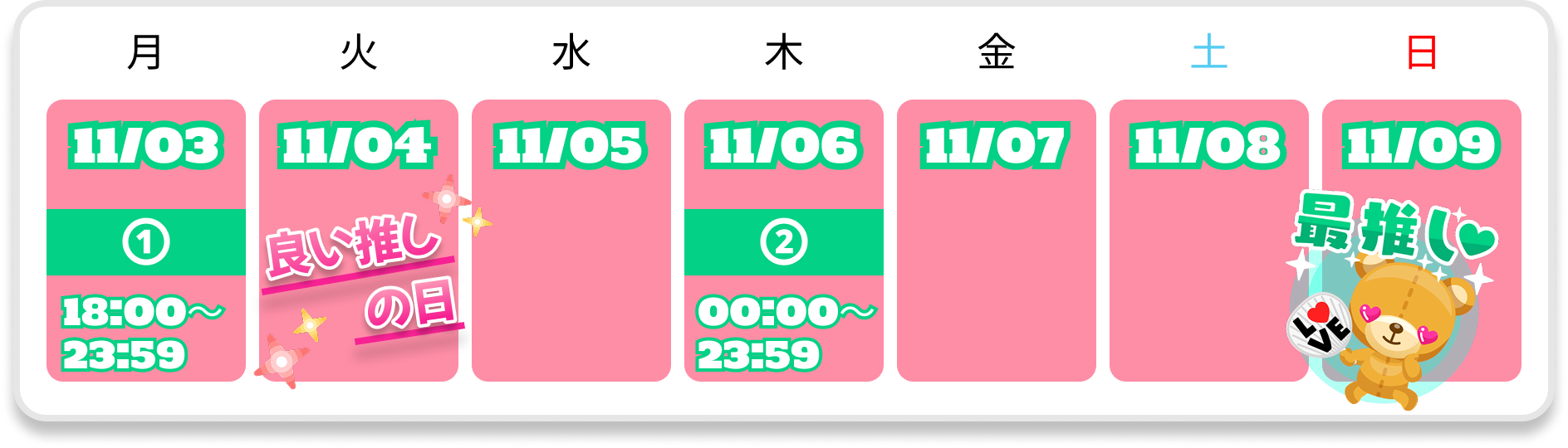 11月4日は「いい推しの日」 推しがいて、推せる時間がある——そんな“当たり前”は、実はとても特別なこと。 この1週間は、「推し」への感謝と愛を伝える特別WEEK! “今、推せる”ことに改めて感謝する1週間! ライバーさんは、リスナーさんへの想いを言葉や配信で届けて、 リスナーさんは、推しへの「ありがとう」をギフトやコメントで伝えよう♡ ※本イベントはSHOWROOM AWARD 2025関連イベントとなります。