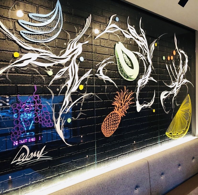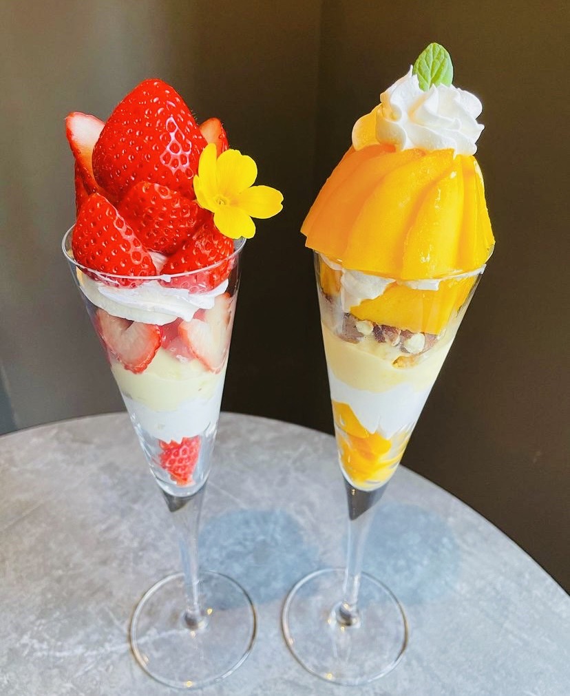 フルーツをテーマにしたポップアートが描かれた壁面やディスプレイ、インテリアなど上質な空間演出にもこだわった店内では、定番の「チョコレートパフェ」「クリームブリュレパフェ」をはじめ、「あまおう」や「さがほのか」といったブランドいちごを使った「いちごパフェ」、「宮崎県直産完熟マンゴーパフェ」など、九州産のフルーツを贅沢に使った多彩なパフェを楽しむことができます。