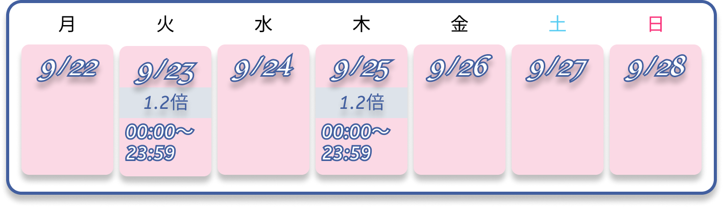 対象者には、2025/9/24(水)23:59と2025/9/26(金)23:59までにポイント加算いたします。