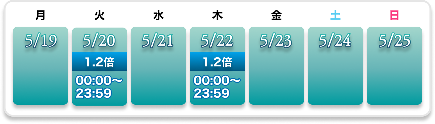 イベント期間2日目(2025/5/20(火))と4日目(2025/5/22(木))の配信ポイントが1.2倍!