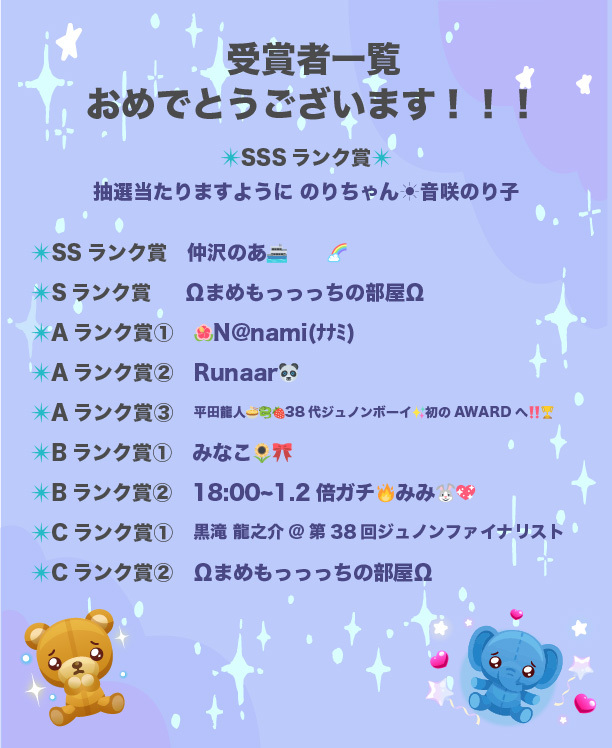 対象者へのご連絡はいたしませんので、ランキング結果でご確認をお願いいたします。