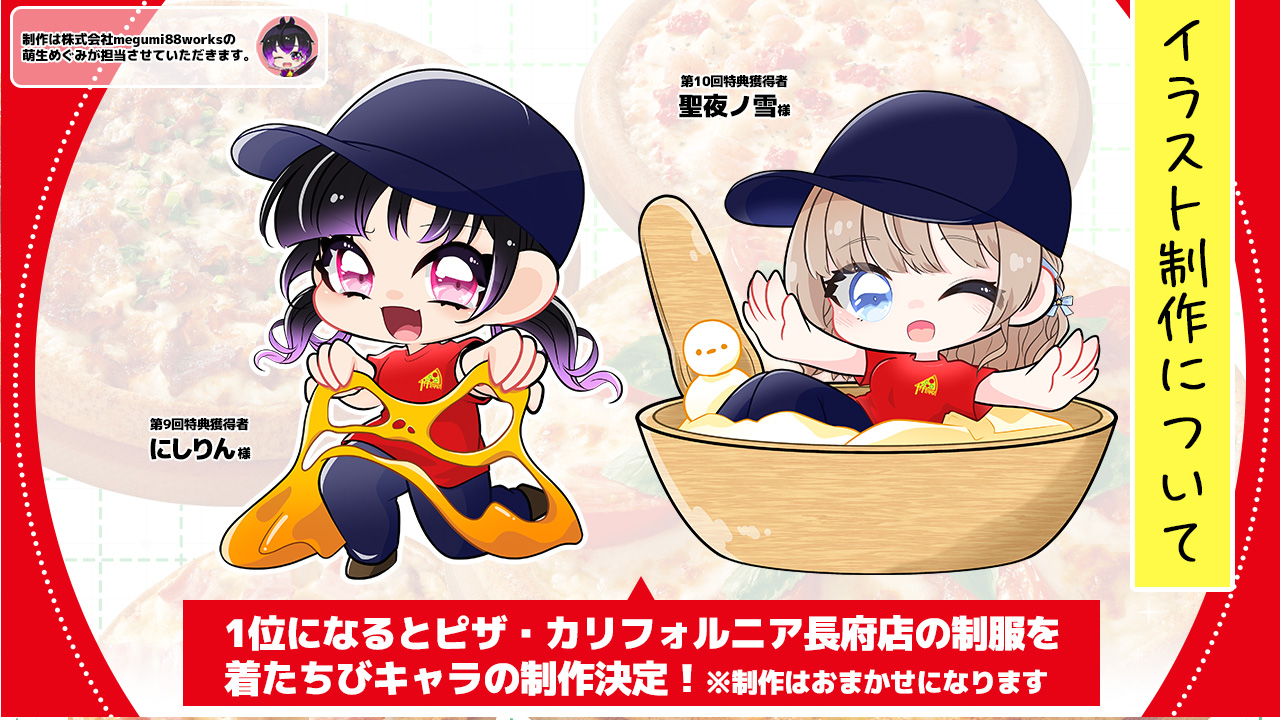 選べる生地・ピザの種類・サイドメニューまで豊富な、山口県下関市で愛されている人気店『ピザ・カリフォルニア長府店』の制服を着たアシスタントちびキャライラストを株式会社megumi88worksの萌生めぐみが制作いたします!イラストは、配達用バイクの荷台、店内掲示の売上商品ベスト10に掲載予定!もちろん商用利用可能なイラストもお渡しします!!ランキング3位までの方は、フリーペーパー『88Activity(パチパチアクティビティ)』の広告枠も付いてきますので、ピザが大好きでちびキャラになりたいライバー様のご参加をお待ちしております!