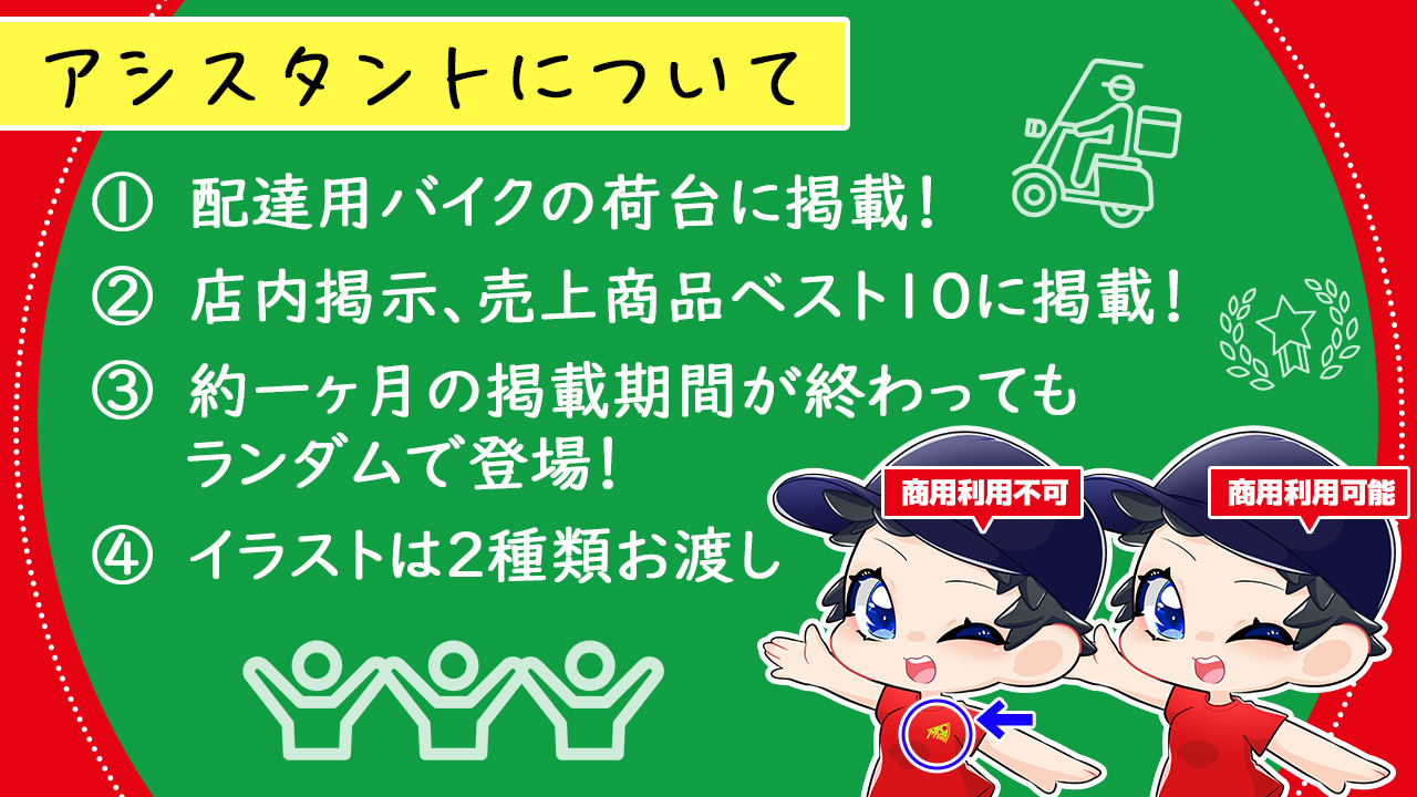 ④制作したロゴ有りアシスタントちびキャライラストは制作者の萌生めぐみ、株式会社エンタクト(ピザ・カリフォルニア長府店)、特典獲得者の3名に著作権が帰属しますが、お互いに許可を取らずに単独で使用できるものとします。(商用利用不可)