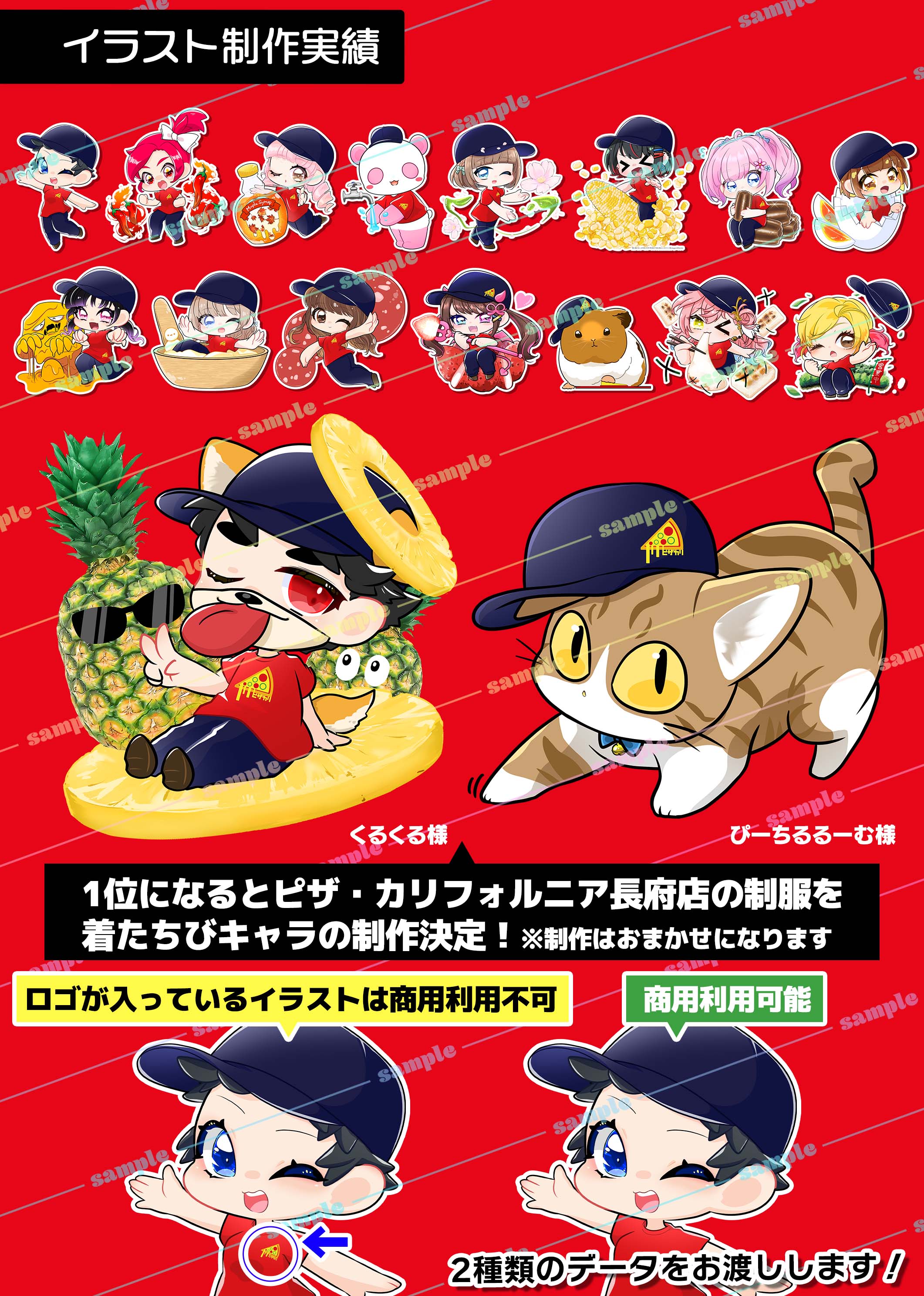 ・イベント特典には含まれていませんが、制作させていただいたイラストは山口県最大の無料クーポン情報誌「MOTTEKE」ピザ・カリフォルニア長府店ページ内に予告なく掲載させていただく予定です。