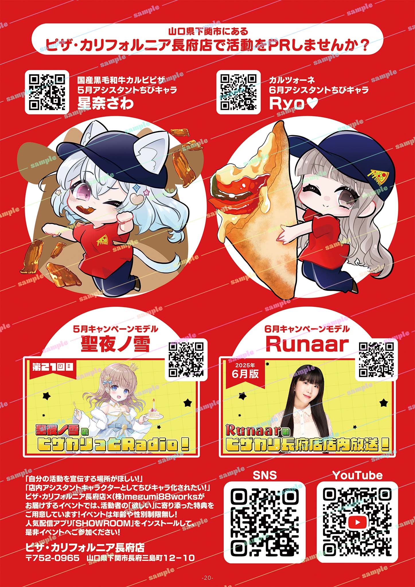 選べる生地・ピザの種類・サイドメニューまで豊富な、山口県下関市で愛されている人気店『ピザ・カリフォルニア長府店』の制服を着たアシスタントちびキャライラストを株式会社megumi88worksの萌生めぐみが制作いたします!イラストは、配達用バイクの荷台、店内掲示の売上商品ベスト10に掲載予定!もちろん商用利用可能なイラストもお渡しします!!ランキング3位までの方は、フリーペーパー『88Activity(パチパチアクティビティ)』の広告枠も付いてきますので、ピザが大好きでちびキャラになりたいライバー様のご参加をお待ちしております!