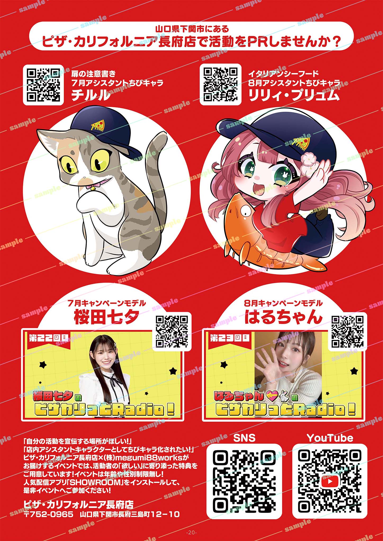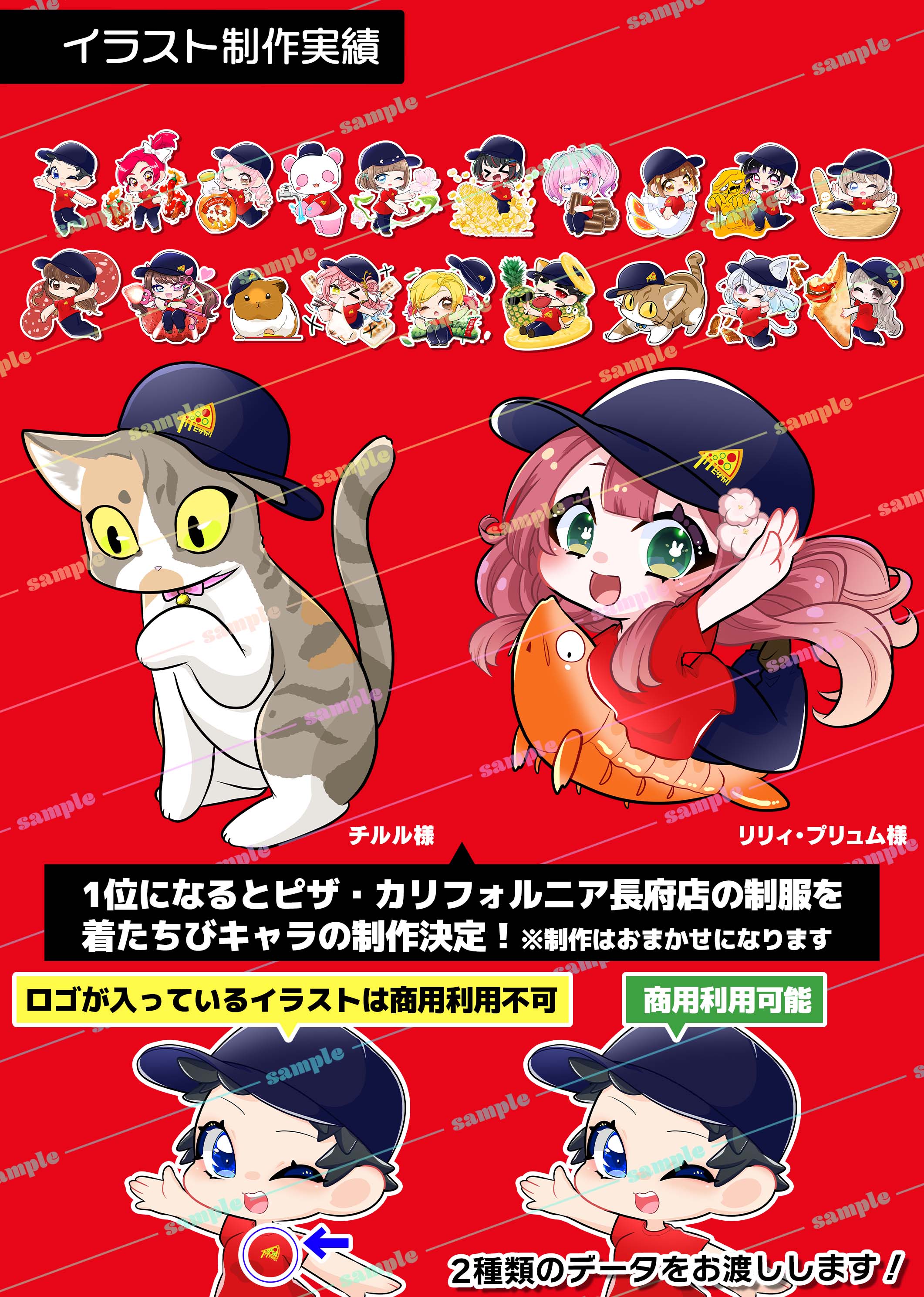 ・イベント特典には含まれていませんが、制作させていただいたイラストは山口県最大の無料クーポン情報誌「MOTTEKE」ピザ・カリフォルニア長府店ページ内に予告なく掲載させていただく予定です。