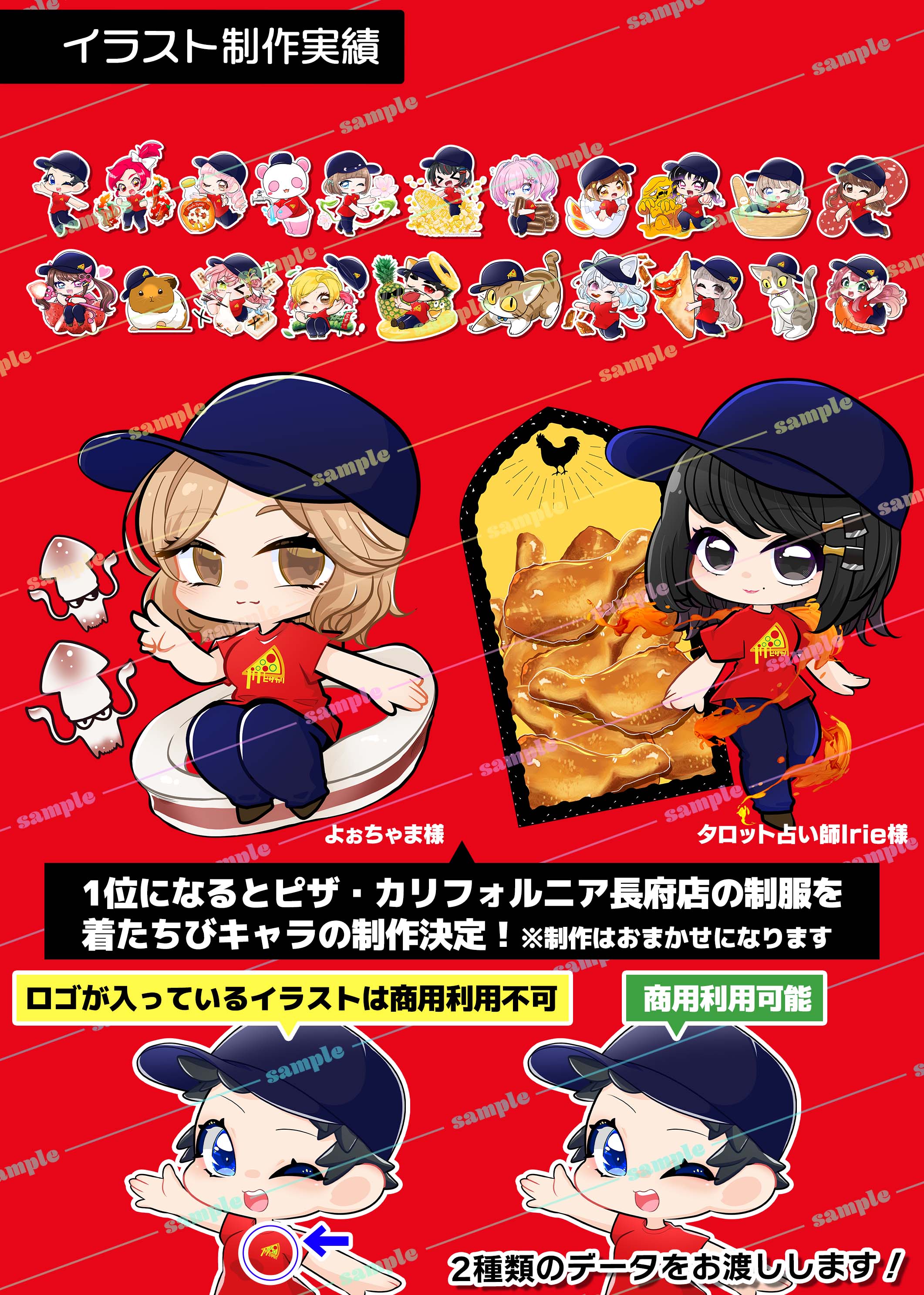 ・イベント特典には含まれていませんが、制作させていただいたイラストは山口県最大の無料クーポン情報誌「MOTTEKE」ピザ・カリフォルニア長府店ページ内に予告なく掲載させていただく予定です。