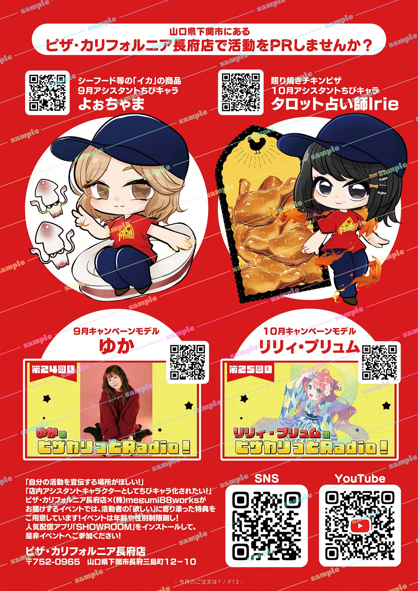 選べる生地・ピザの種類・サイドメニューまで豊富な、山口県下関市で愛されている人気店『ピザ・カリフォルニア長府店』の制服を着たアシスタントちびキャライラストを株式会社megumi88worksの萌生めぐみが制作いたします!イラストは、配達用バイクの荷台、店内掲示の売上商品ベスト10に掲載予定!もちろん商用利用可能なイラストもお渡しします!!ランキング3位までの方は、フリーペーパー『88Activity(パチパチアクティビティ)』の広告枠も付いてきますので、ピザが大好きでちびキャラになりたいライバー様のご参加をお待ちしております!