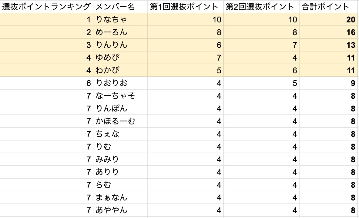 合計選抜ポイントランキングは以下の通りです。