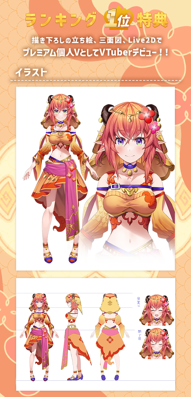 本イベントでランキング1位になった方は、蓮禾氏描き下ろしの立ち絵、三面図で個人VTuberとして活動をスタートできます!