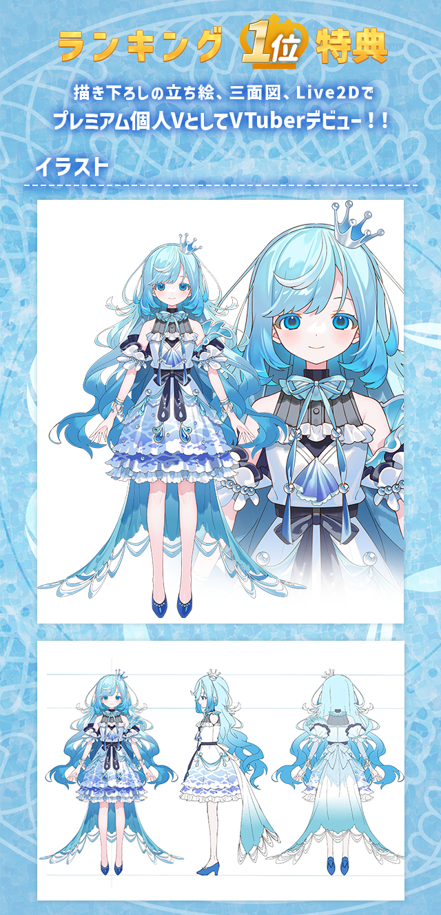 本イベントでランキング1位になった方は、やみや氏描き下ろしの立ち絵、三面図で個人VTuberとして活動をスタートできます!