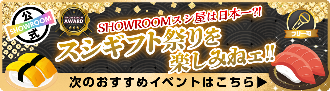 ・本イベントはSHOWROOM株式会社が運営しております。 ・下記注意事項およびSHOWROOM会員規約その他のルールを守って配信しましょう。 ・他者が嫌がるような迷惑行為はしないようにしましょう。 ・審査状況や選考基準に関するお問い合わせには基本的にお答えできかねます。 ・応募・審査通過等によって生じる権利を第三者に譲渡・質入等することはできません。特典の対象は獲得したルームの方のみです。特典を獲得したルームの方以外の方(グループ全体、グループメンバーなど)が特典を実施することは禁止といたします。 ・アバター、ギフティングアイテム等デジタルコンテンツの制作権を獲得された場合、SHOWROOM株式会社が作成する[ガイドライン]・[利用規約]に準じている作品の制作をお願いいたします。これらに違反している場合は、獲得したコンテンツをご利用いただけませんので十分ご注意ください。 ・本注意事項およびSHOWROOM会員規約その他のルールに違反した場合またはその他当社が不適切であると判断した場合は、応募及び結果を無効とし、または取り消す場合があります。 ・応募条件を全て満たさずにエントリーされた場合には、いかなる理由であってもエントリーを取り消し、特典の権利を無効とさせていただく可能性があります。 ・バーチャルライバーに関しては各人の世界観により定義された性別です。 ・イベントを途中離脱された場合には、いかなる理由であっても特典の権利を無効とさせていただきます。該当のライバーにギフティングされたリスナーへの返還、返金等もいたしかねますので、予めご了承ください。 ・金銭、物品、その他プレゼント(チェキ、お礼カードは除く)を視聴者に贈り応援を促進させる行為は禁止します。 ・重複アカウントによる応援は禁止です。重複アカウントによる応援ポイント分は発覚次第、減算を行います。なお、当サービスのセキュリティ上、対応や減算の仕組みの詳細に関しましては個別にご案内を差し上げておりません。予めご了承ください。 ・本アプリ内で開催されるキャンペーン・イベント・コンテスト等にアップル社、グーグル社は一切関係ありません。 ・天災、不慮の事故などのやむを得ない事情により特典履行が行えない場合、特典が変更・補填・中止となることがございます。予めご了承ください。 ・万が一、前項に定める事由による特典履行が変更、中止となった場合、その他本イベントの応援ポイントが取り消しされた場合であっても、SHOWROOM株式会社は当該応援ポイントにかかるデジタルコンテンツまたはShow Gold、現金その他の返還はいたしません。予めご了承ください。 ・イベント終了後に減算されてポイント未達成になった場合、特典は取り消しとさせていただく場合があります。 ・ランキングが関わるイベントの場合、グループメンバー同士(グループアカウント、個人アカウント問わず)、または、イベント参加者の関係者(マネージャー・プロデューサーなどの直接的な利害関係者)の応援はコメントのみ可能とし、有料ギフト・無料ギフトによる応援は禁止とさせていただきます。 ・公式ライバーの方が報酬のある特典を獲得された場合は、所属オーガナイザー・所属事務所等にご確認の上ご対応ください。