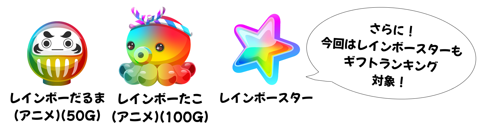 条件2:レインボーたこ(アニメ)(100G)を、イベント参加ルームに2個ギフティングする