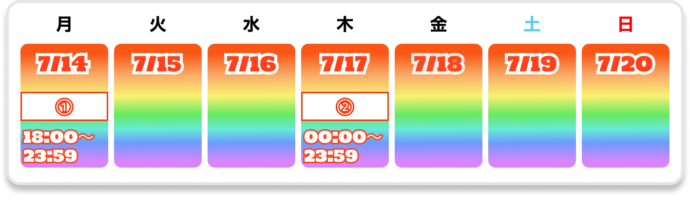 虹ラン①:2025/7/14(月)18:00〜23:59虹ラン②:2025/7/17(木)0:00〜23:59